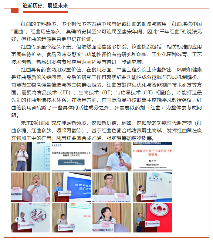 千年紅曲,經(jīng)久不衰,2022東方紅曲國際學(xué)術(shù)研討會在眾多與會專家、企業(yè)家的精彩分享與熱烈討論中圓滿落幕,相信紅曲產(chǎn)業(yè)能夠以科技創(chuàng)新為導(dǎo)向,逐步解決產(chǎn)業(yè)化中的瓶頸問題,也期待將來紅曲的研究與應(yīng)用能夠涉足新領(lǐng)域,開拓新藍(lán)海!